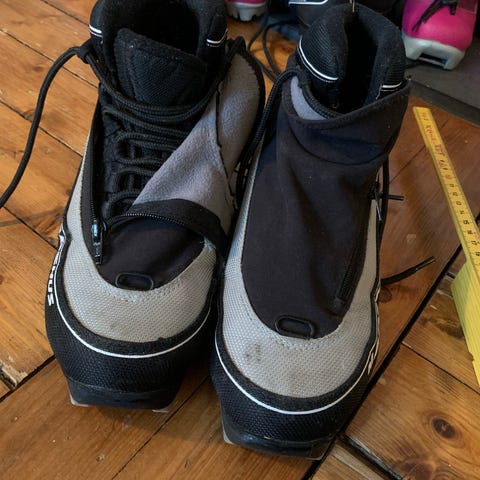 Madshus langrennsko med glidelås foran og forsterket tå- og hælområde. Skoene har en kombinasjon av svart og sølvfarget materiale, noe bruksmerker på utsiden av venstre sko (se bilde). Ellers i finfin stand.