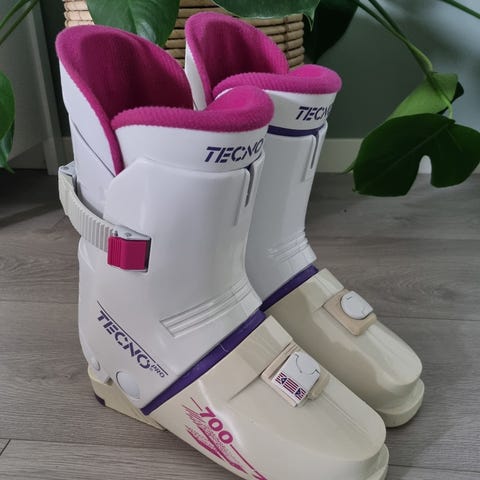 WED'ZE Downhill 500 alpinski støvler i størrelse 215. Støvlene har hvit og lilla fargekombinasjon og er designet for alpinski. De har spenner for justering og polstret innside for komfort.