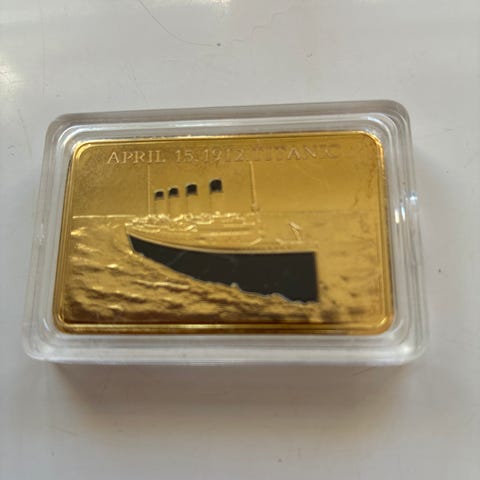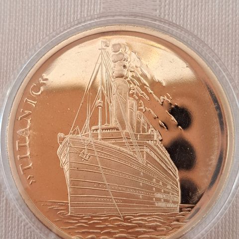 Selger en dekorativ Titanic samlebar i sølvfarge, levert i beskyttende plastkapsel.