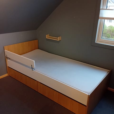 2 stk Jysk kongsberg enkeltseng med beige stofftrekk og treben. Har katt i hus så di med allergi vet om det. Kr.1300,- pr seng. Kun 7 mnd gammel.