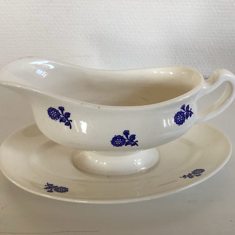 Egersunds Fayansefabrikk sausnabb med to tilhørende serveringsfat i fayanse. Fatene har blå blomsterdekor og er egnet for servering av saus og matretter. Passer til bruk ved borddekking og servering.