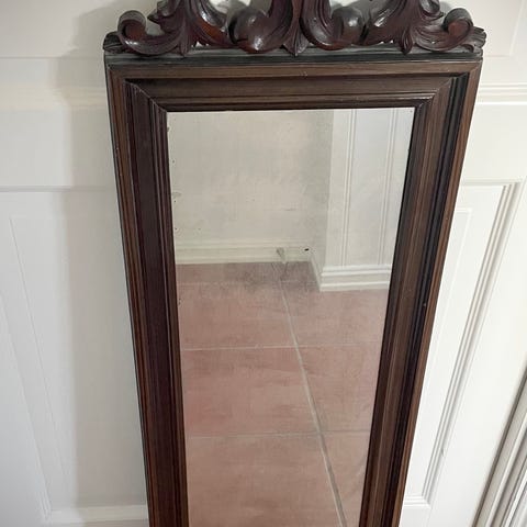 Antikk dekorativ veggspeil med gullfarget ramme. Speilet har en detaljert og utsmykket design som passer til klassisk innredning.