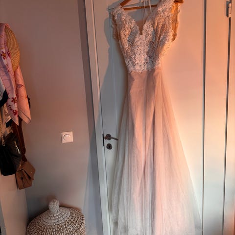 Kjolen er tilpasset noe og armer er sydd på. Slør med blondekant følger med.