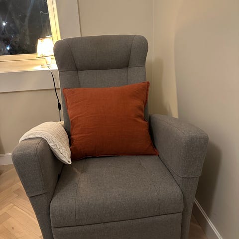 Veldig behagelig og med skammel som også gynger. Er laget av møbelsnekkeri. Knirker litt når man gynger, så bør smøres opp nå. Noen flekker, men kan vaskes/renses enkelt.