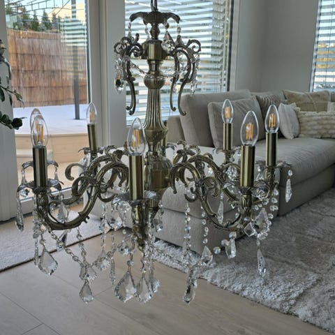 Flott 10 armet lysekrone i krystall. Meget pen og gir et utrolig fint lys i rommet!!