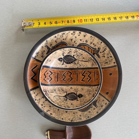 Stor: 28 cm dia, 9 cm høy (prislapp 200.000 IDR ~225 NOK).