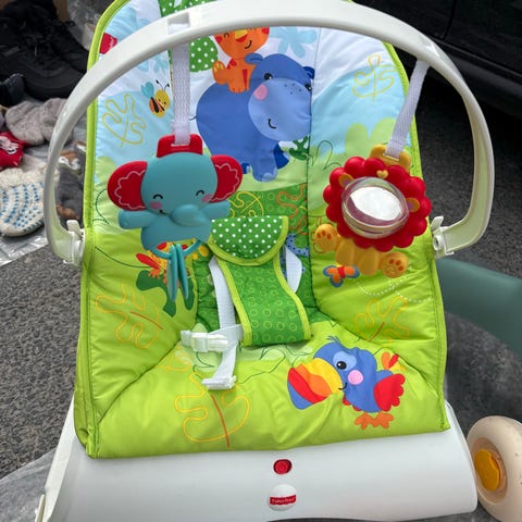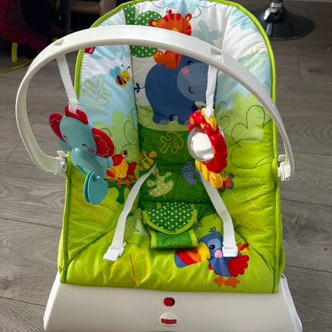 Fisher-Price barnestol med fargerikt dyremotiv. Designet for barn, laget av mykt materiale for komfort. Passer til bruk som sitteplass for små barn.