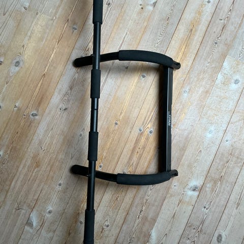 Levity Pull Up Bar treningsutstyr for styrketrening. Designet for montering i dørkarm for kroppsvektøvelser som pull-ups og chin-ups. Laget av metall med polstrede grep for komfort under trening.