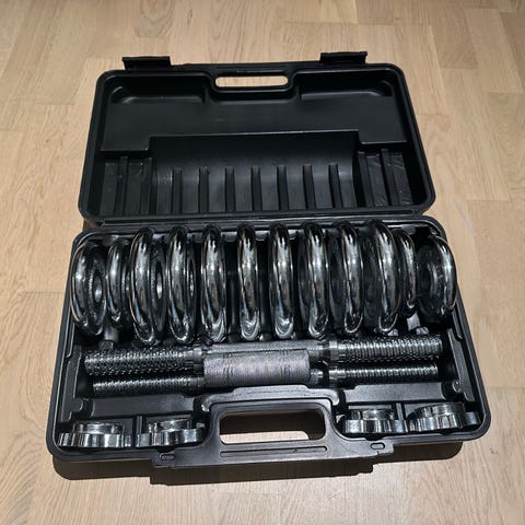 Selger et komplett styrkesett i praktisk oppbevaringskoffert. Perfekt løsning hvis du vil ha mye utstyr samlet på lite plass.