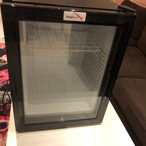 Temptech JC-65G termoelektrisk vinkjøler med kapasitet for flere flasker. Kjøleren har svart farge og glassdør med Temptech-logo. Strømforsyning: 220-240V, 50Hz, effekt på 70W. Passer for oppbevaring og kjøling av vinflasker.
