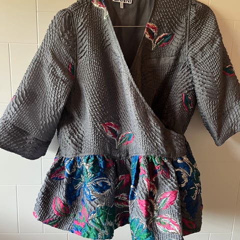 Ganni topper i størrelse 34/Xs fargen svart. Toppen har puffede ermer og knappelukking foran. Materialet har en tekstur som gir et unikt uttrykk. Designet for kvinner.