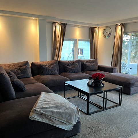 Selger en stor og veldig komfortabel U sofa kjøpt hos A Møbler i 2018 (nypris Kr. 25.000). Sofaen er romslig og passer perfekt for stor stue og familie, med god dybde og mye sitteplass.