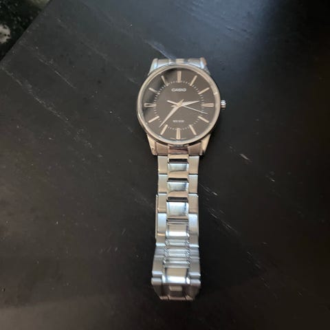 Casio herreklokke med rund urskive, svart reim og kombinasjon av sølv- og gullfarget urkasse. Klokken har analog visning med tydelige tall og visere. Dato. Stoppeklokke.12- 24 timer visning nytt batteri kan hentes i Solbergelva gi bud