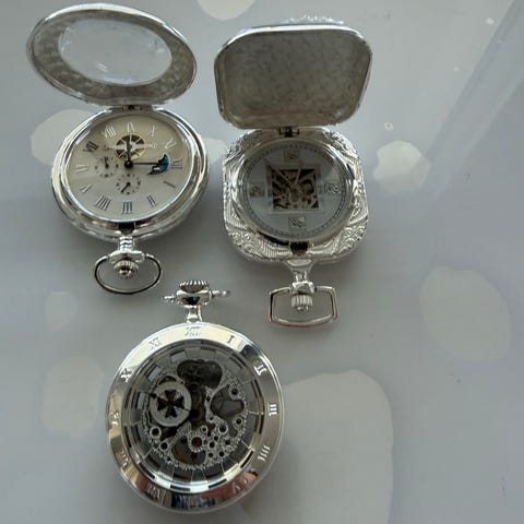 Selger en samling med 15 dekorative lommeur i vintage/skeleton-stil.