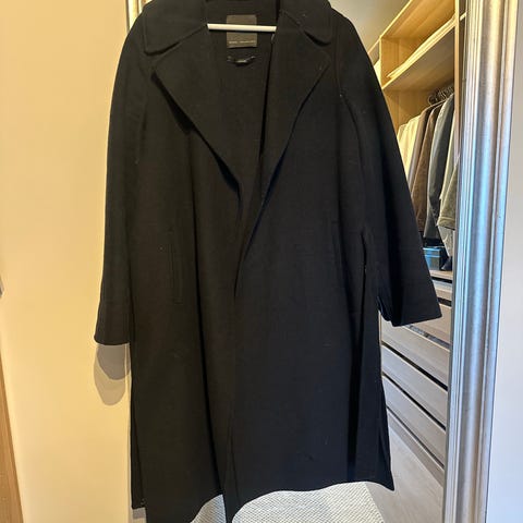 Zara ullkåpe i størrelse XS, farge svart, laget av 50 % ull og 50% polyester.