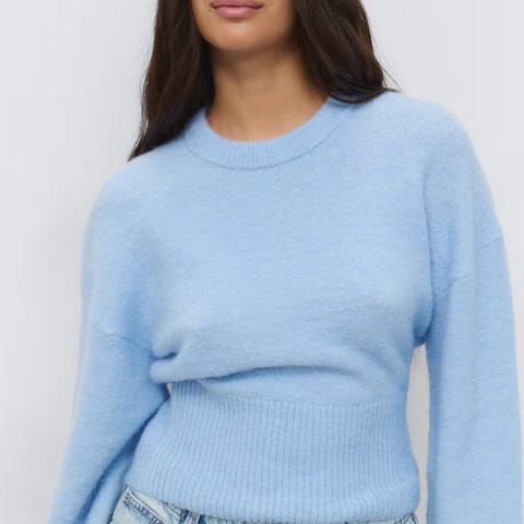 Strikket genser med oversized passform. Genseren er svart og har finstrikket kvalitet. Den har rund hals, langt erme, normal lengde og ribbestrikk ved ermeslutten og i nedre kantAcrylic 52%, Polyester 25%, Ull 14%, Alpackaull 7%, Elastan 2%