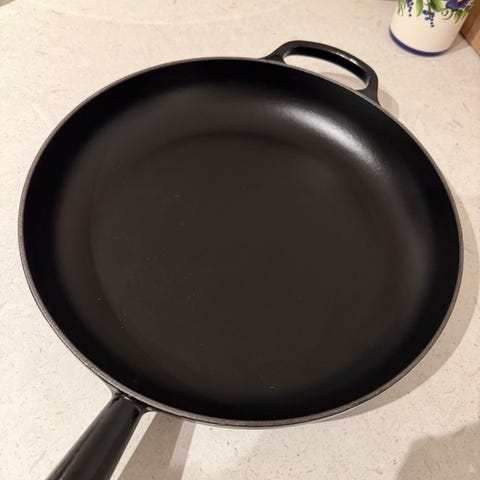 Le Creuset stekepanne med treskaft. Treskaftet gir et godt grep under matlaging. Kan sende flere bilder dersom ønskelig.