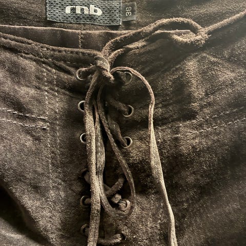 Selger denne flotte semsket skinnbukse. Det står str 38, men er nok mer en 36. Se målene på bildene.