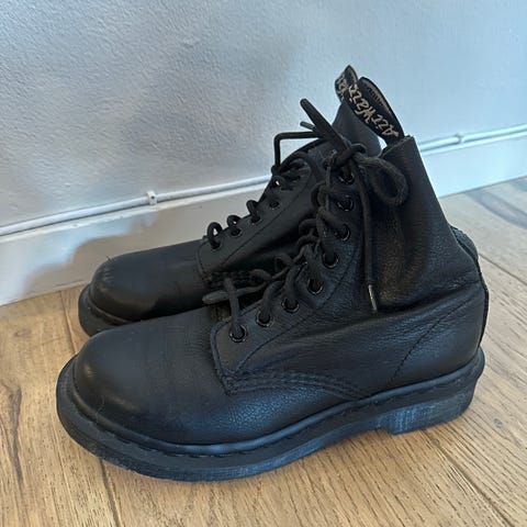 Dr. Martens boots i størrelse 39 (bruker 40 til vanlig og passer meg fint). Brukt, men ikke på lenge. Gjør bare at de får en vintage look. Skoene har en mørkerød/lilla farge og er laget av lærmateriale, og en solid gummisåle.