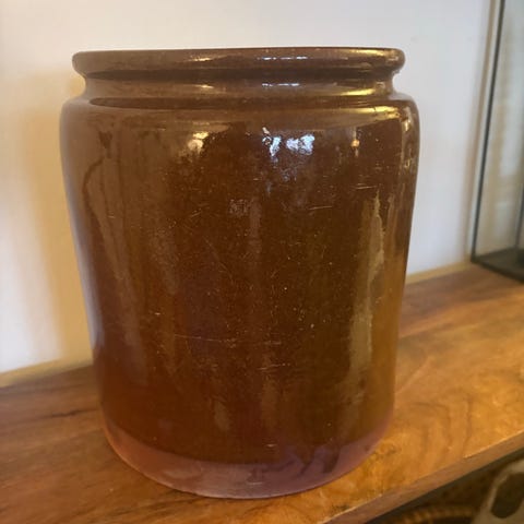 Brun keramisk krukke med glassert overflate. Passer til oppbevaring eller dekorative formål.