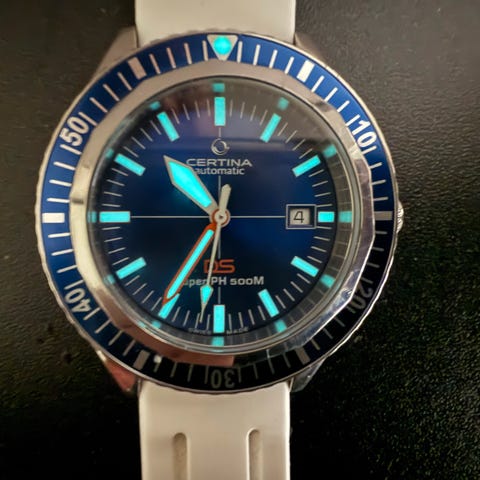 Klokken er komplett, med tags, inner/ytterboks og 2 reimer i kalveskinn med butterfly spenne.
