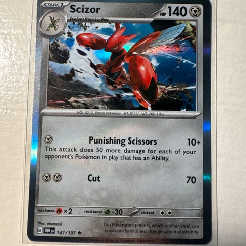 Kult pokemonkort av Scizor fra Obsidian Flames settet utgitt i 2023. Illustration Rare Holokort, nr.205/197. Sleevet og lagret i kortboks.