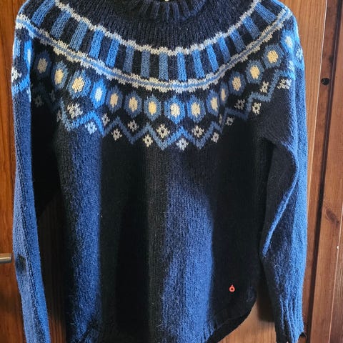 Kari Traa strikkagenser i flerfarget design laget av ull og alpakkaull ++ Størrelse M, tilpasset kvinner. Genseren har et mønster rundt halsen og er laget for å gi varme og komfort.