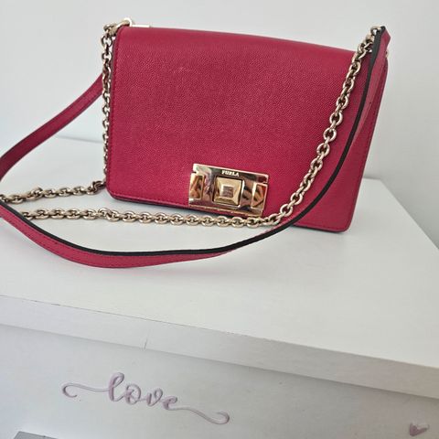 Liten rød veske med gullfarget kjede til salgs.