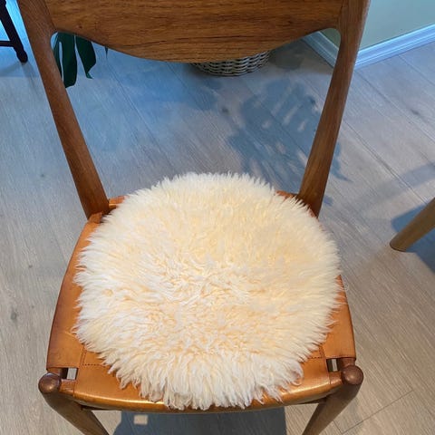 Kjempefint og tykt saueskinn i hvitt. Tror det er ekte saueull, uten at jeg skal si det helt sikkert. Fremstår pent og rent.