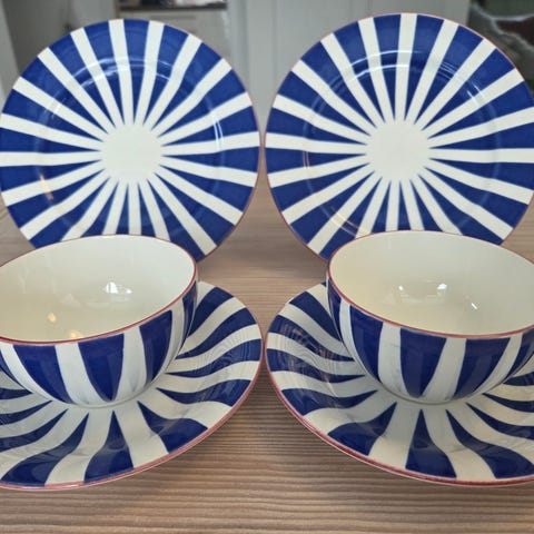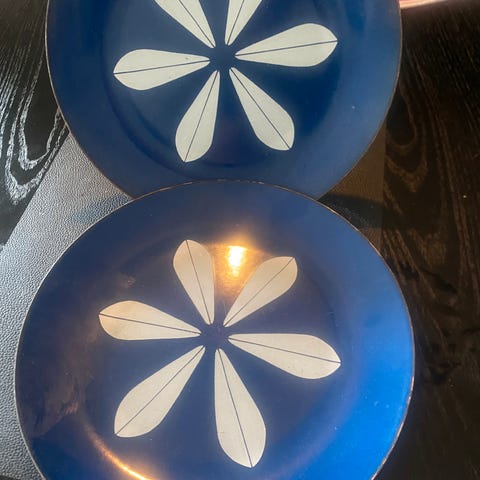 Selger ett «sett» bestående av 1 stort fat, 1 lite fat og 6 tallerkener. Dette er Stavanger Flint designet av Inger Waage.