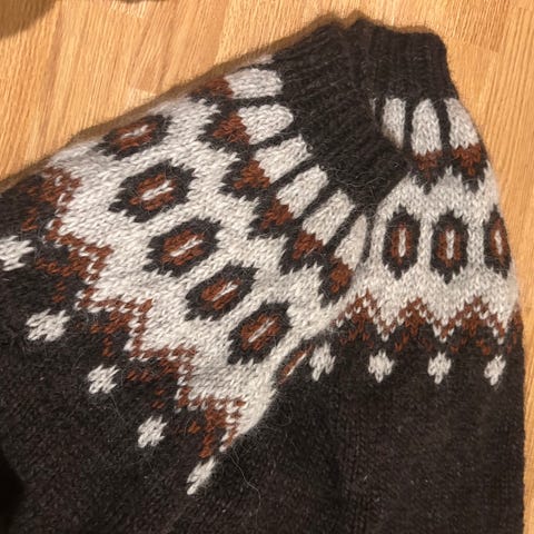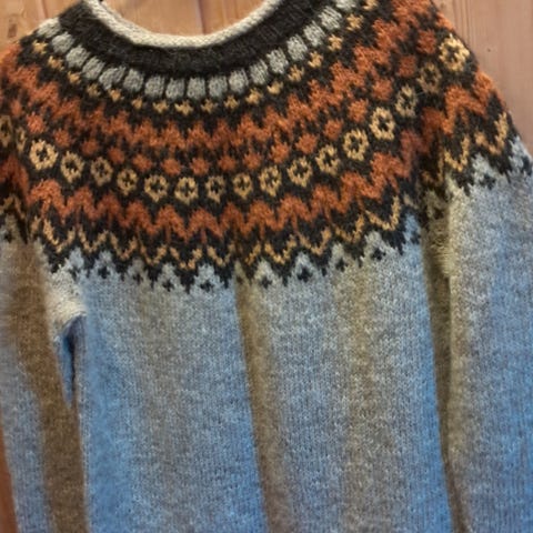 Nydelig ullgenser med det klassiske islandske mønsteret.