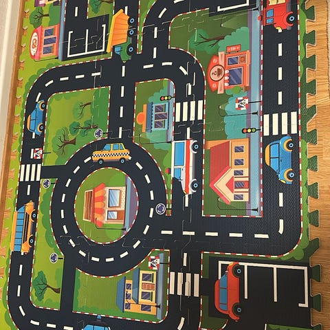 lekematte for barn med fargerikt design som inkluderer dyr og blomster. Laget av tekstilmateriale med ulike teksturer og elementer som kan stimulere barnets sanser. Egnet for lek og tidlig utvikling.