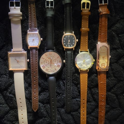 Selger en samling av 12 varierte dameklokker i ulike stiler, fra klassisk med skinnrem til mer dekorative modeller med strass og detaljer i gull/roségull.