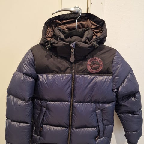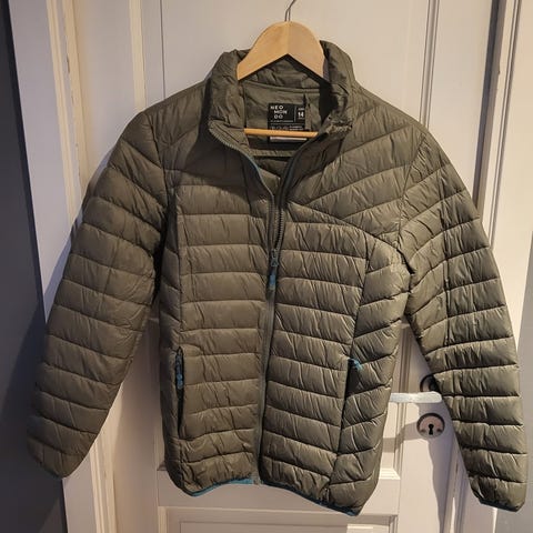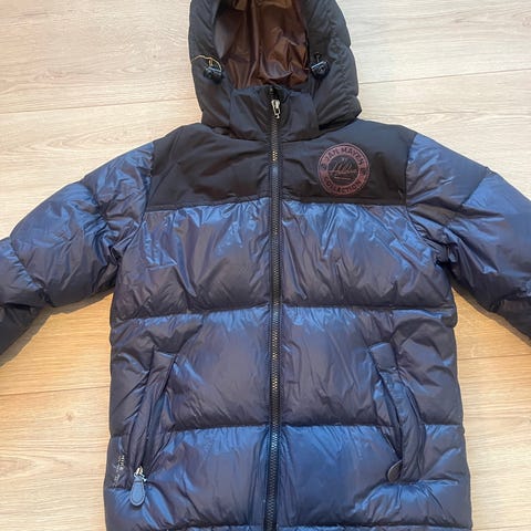 To fine og gode dunjakker selges for 100kr stk. Den blå er str 10 år, den beige er str 14 år. Kan pakkes sammen i en liten pose, enkelt å ta med på tur. Merke: Heldre.