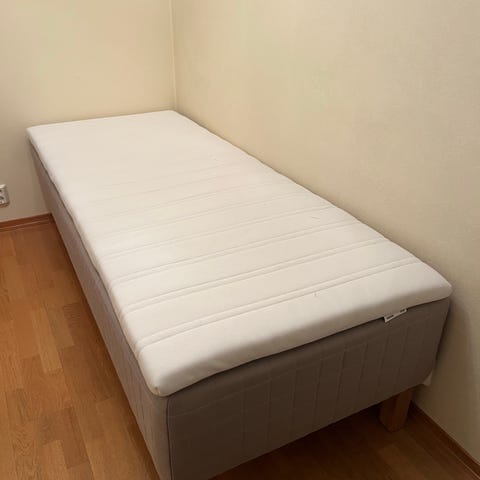 Den ble brukt med overmadrass, noe som gjør at selve madrassen er i veldig god stand. Overmadrassen beholder vi.