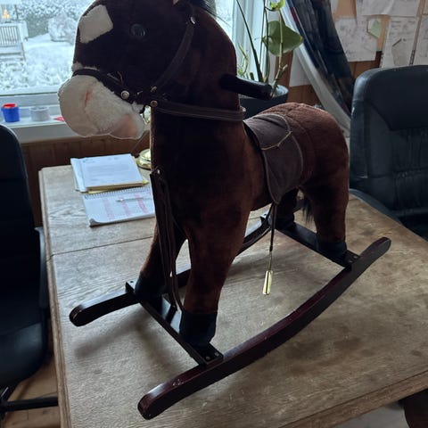 IKEA Klattring Hest gyngestol i tre med hvit base, rødt sete og grønne akter. Passer som leke- og aktivitetsstol for barn.