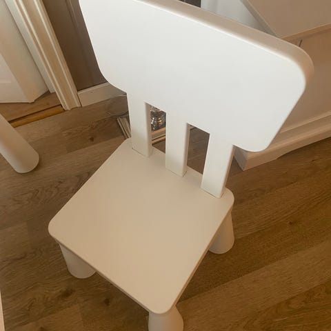 Barnekrakk i en varm gulfarge, med malt løvemotiv. Krakkene har flere overflate hakk i sitteplaten. Ingen betydning for bruken.
