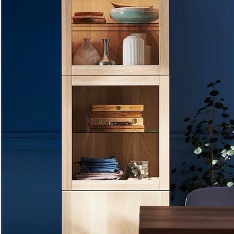 Vitrineskap fra IKEA i serien «Blåliden». Kjøpt for 1-2 år siden, ingen synlige skader og fremstår som nytt. Det består av glassvinduer og en dør som holdes lukket med magnet. Det er tre glasshyller, samt bunn som også kan brukes som oppbevaring.