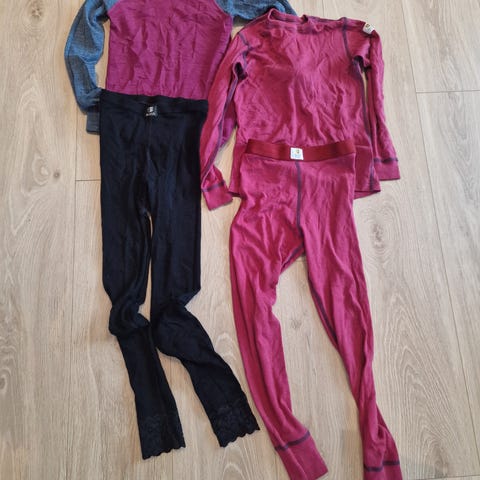 Ullundertøy i størrelse 134 uten flekker og hull. Tre topper/gensere og en bukse. Ullbukser er tynn og perfekt å ha under vinterdressen på kalde dager.