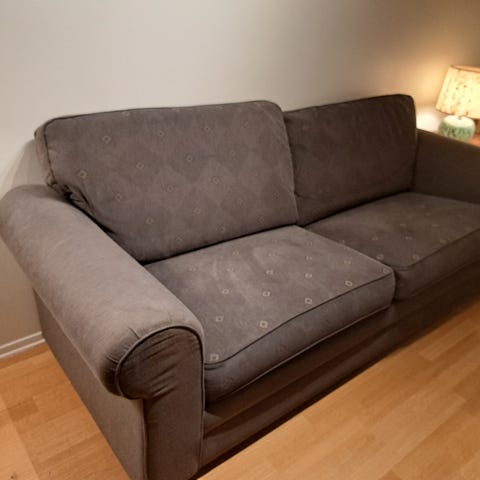 Sofaen er komfortabel og stoffet er i god stand. Vanlige bruksspor, men ingen rifter, brudd eller alvorlige skader.