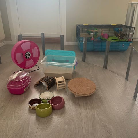 Trixie hamsterbur i rød og svart farge. Buret har et hus, vannflaske, hjul og matbolle. Egnet for små kjæledyr som hamstere. Inkluderer også strø og mat for hamster.