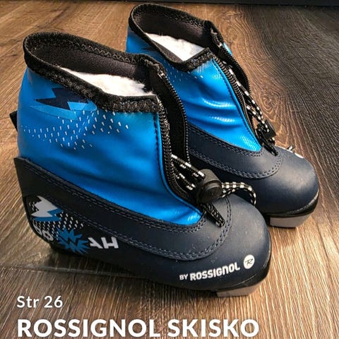 Rossignol Power Cross skisko i størrelse 27. Støvlene har en blå og svart fargekombinasjon og er foret med mykt materiale for varme og komfort.