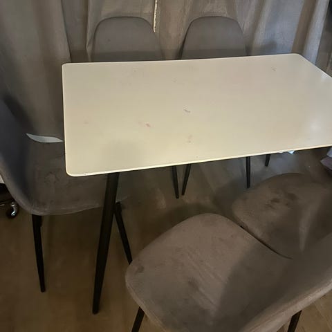4 like spisestoler i hvit med svarte bein. Vet ikke hvor de er fra. Stødige og gode stoler, med noen få lite synlige flekker/merker (se bilder).