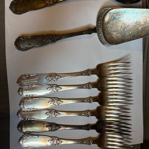 6 stk. gafler, 1 stk. syltetøyskje og 1 stk. tomatspade selges samlet kr 600,-. Alt er pent og lite brukt.