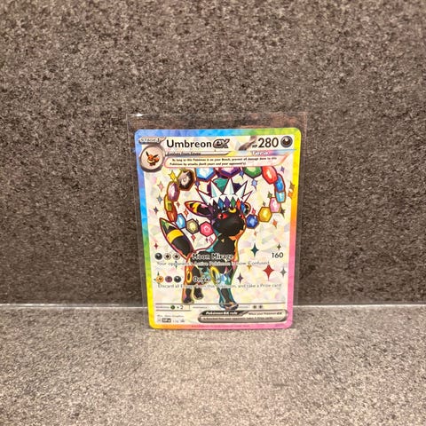 Umbreon Ex #176 & Espeon Ex #175 med figur, samlerpin, og sleeves selges samlet.
