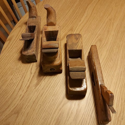 Ryddet på vårt gamle båtbyggeri. Langhøvel 70cm, 3.0kg. Mellomstor 40cm, 2.1kg. Buet tohånds 35cm, 1.3kg. Alle brukbare med stål, høveljern. Selges samlet. Egner seg også som maritim utsmykking.