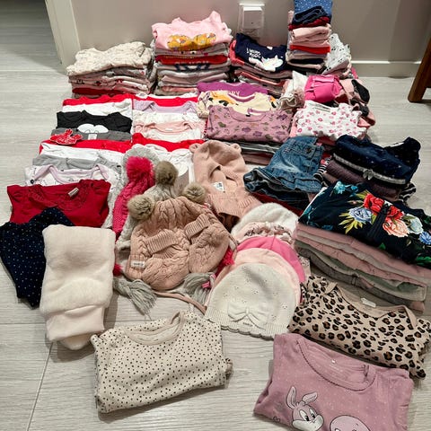 Klær for jente i størrelse 74 med morsomme mønstre og fine farger. Noe er i 80-92. Mange luer og noen leker.