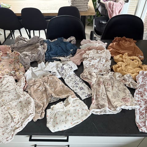 Newbie barneklær for jente i størrelse 56/62 med flere plagg i ulike farger og materialer. Inkluderer blant annet kjoler, romper og bluser med blomster- og ensfarget mønster.