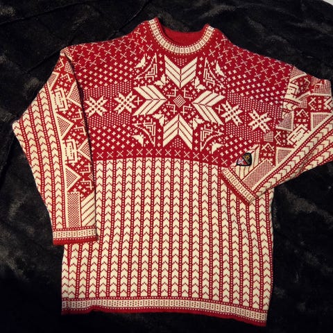 Hjemmestrikkede ullstrømper følger med.
