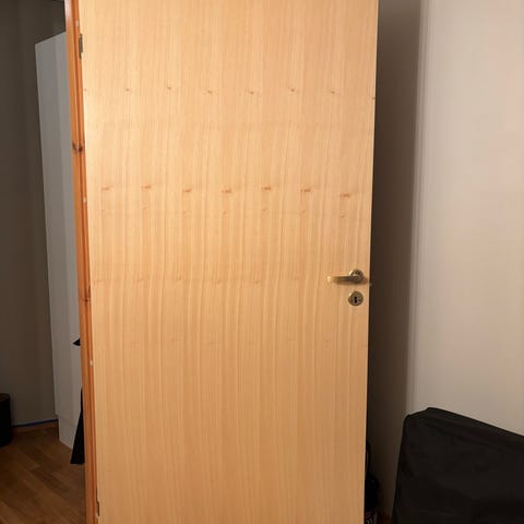 Innerdør i tre med naturlig trestruktur og lås. Døren har en glatt overflate og er tilpasset bruk innendørs. Passer for montering i bolig eller kontor.
